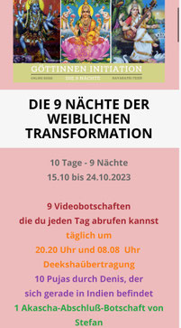 Die Reise wird ebenso aus Indien, von einem meiner engsten Begleiter unterstützt. Dort werden täglich von 10-13 h Pujas/Yagyas durchgeführt und um 19 h dann eine Spezielle Navaratri Zeremonie. Wenn du dich registriert hast, wir dein Name mit eingebunden. Bitte dies tun auch wenn du gespendet hast. Indien liegt zeitlich 3,5 h vor uns.